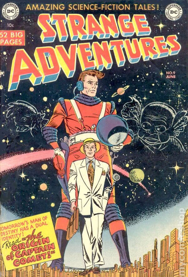 That distinction belongs officially to Adam Blake, “Captain Comet,” who got his start in Strange Adventures #9 a full year before Barry stepped on the scene. Blake was the original test case for taking the established superhero template and applying heavy doses of Buck Rogers. Like Superman, Blake was the son of a midwestern family who grew up to exhibit extraordinary powers. The difference, however, Blake’s origins, powers, and adventures were keyed into science fact and fiction.
