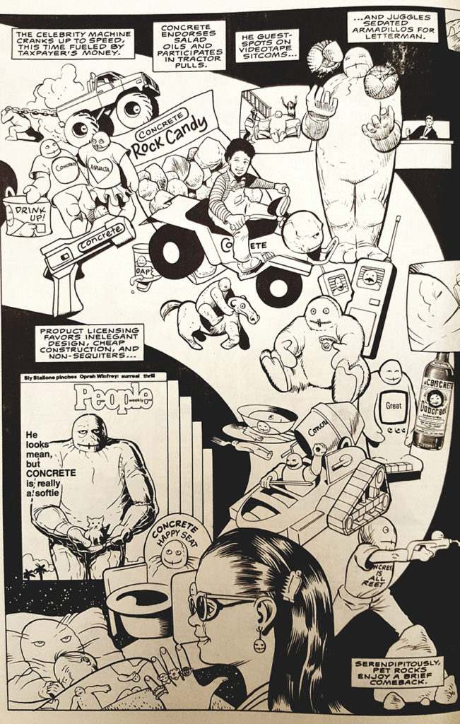 Paul Chadwick wasn’t doing any of that. His story of a political speechwriter who got turned into a concrete golem by aliens sounds like a traditional comic book premise, but the approach is different. Concrete spends most issues just trying to figure out how to be a person. It’s a book filled with anxiety and loneliness and love, making it a “compassion over conflict” book long before Vertigo “pioneered” that approach.