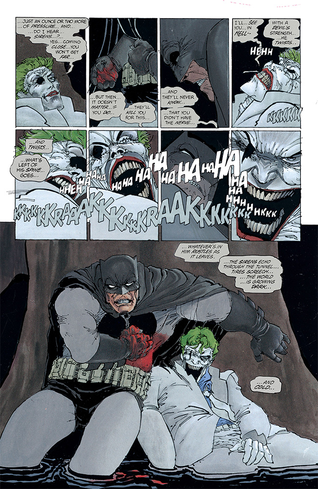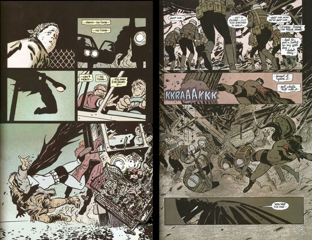 This approach to the character of Batman was simultaneously directly in line with the character’s early pulp roots and a dramatic reinvention. Bruce Wayne, charming playboy billionaire, had been replaced by a single-minded soldier. The book’s old daring-do tone was similarly replaced by the simple, unalloyed growl of a man hollowed out by tragedy.
