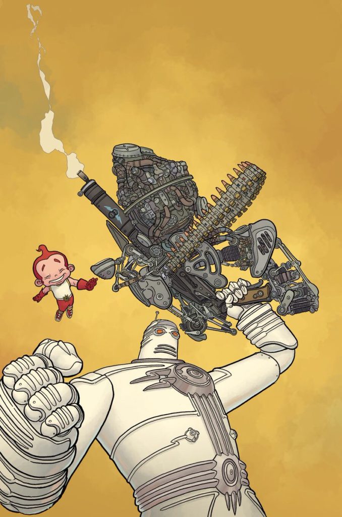This is not to say that Miller’s contributions go unappreciated. His story is a delightful juxtaposition. The plot is simple enough: a monster escapes from a lab and can only be stopped by a useless, self-doubting robot child and an enormous, monotone mecha. But Frank maintains his ridiculously over-wrought voice, which is absolutely pitch-perfect here.