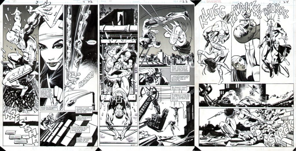 But it was the Film Noir sensibility that really captured people. Noir transformed Daredevil’s New York into a whole new city. One completely different from the one Spider-Man knew. In this shadow city, criminality was rampant. Murdock could see through his job that corruption was pervasive. There were sex and death for sale everywhere. And through it all came the familiar, streamlined cadence of Mikey Spillane. And, in Elektra, the romance of Bogart and Bacall.