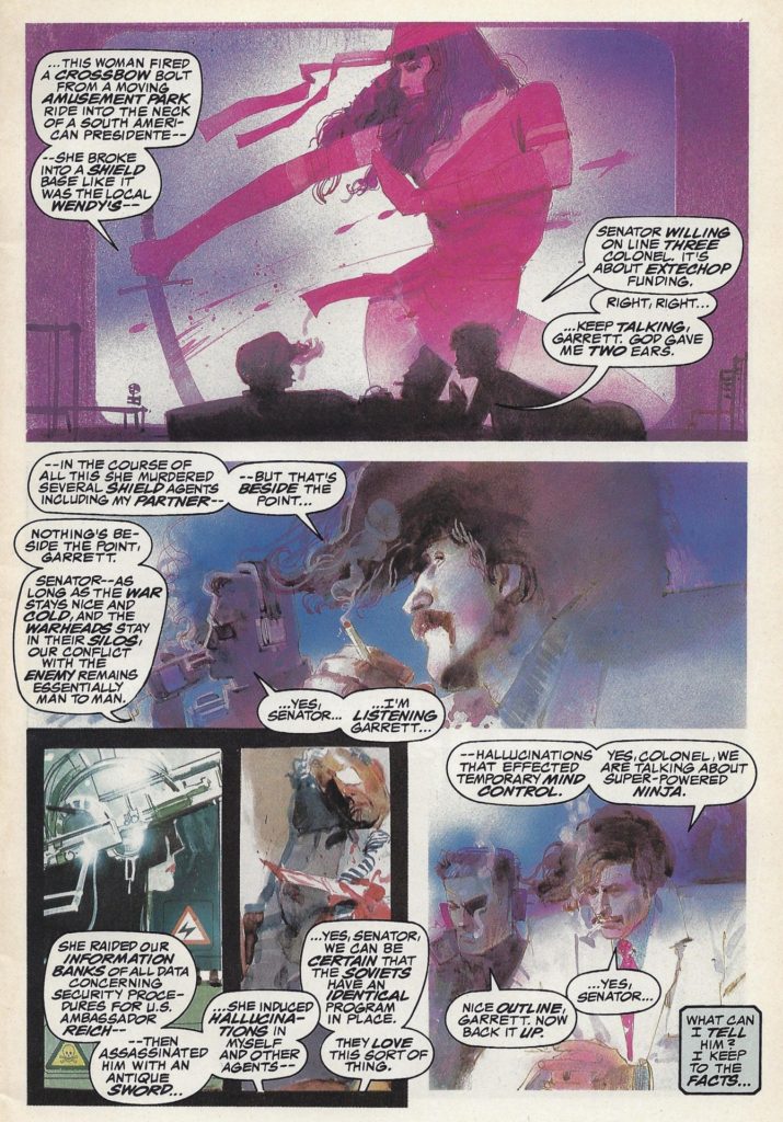 Miller’s genius move was in repeating his success on Daredevil step for step. Elektra Natchios was never just Matt Murdock’s love interest, but her solo stories pushed her into a character completely independent from Daredevil. Miller focused on her connection to the Hand in order to really push the magical nature of her life. Murdock became reason, while Natchios became superstition. The looks of the books then progressively followed suit until Miller’s fateful partnership with legendary artist Bill Sienkiewicz.