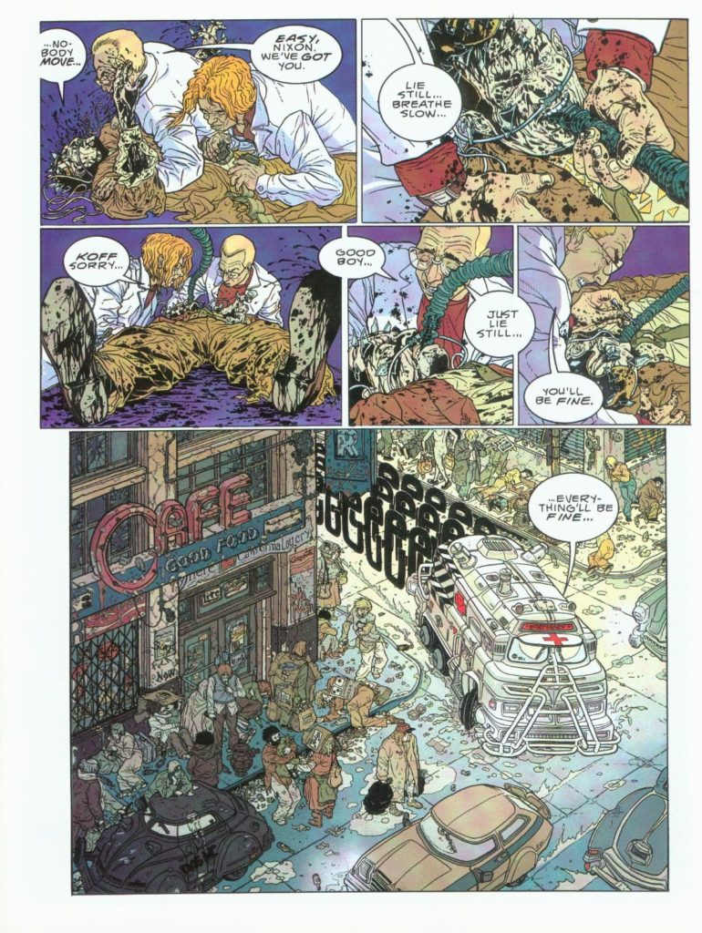 Miller and Darrow’s first collaboration that I’m aware of was actually 1990’s Hard Boiled. But where Big Guy and Rusty could be seen as a child’s imagination as fueled by nostalgia, Hard Boiled would be a teenager’s daydream of a cyberpunk future. There’s humor in both, Japanese and American influences in both, and a wild time in both… it’s just that one is age-restricted.