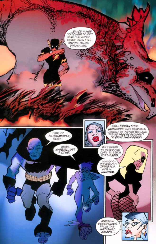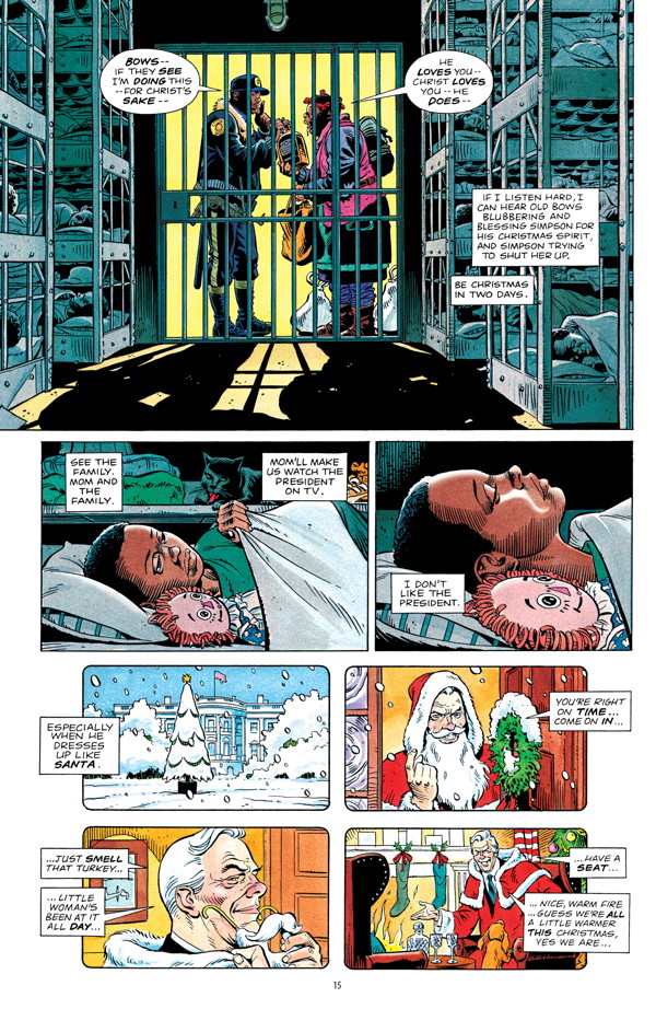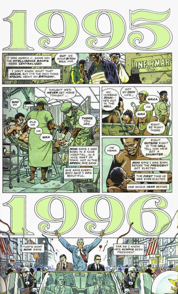 That said, Washington is an interesting hero for Miller. She’s not merely clever, but genuinely smart with a gift for computer programming. Which leads to the next point: she’s not a flat stereotype. For once, Miller makes a fully three-dimensional female character who is capable, sympathetic, and if not morally good than certainly on the side of right. Even more amazingly, the world he’s given her is an honest-to-god satire. I’m not kidding, the story doesn’t just play at being smart commentary, but actually is. Funny, too (though this is helped greatly by Dave Gibbon’s artwork and it’s sly detail.)