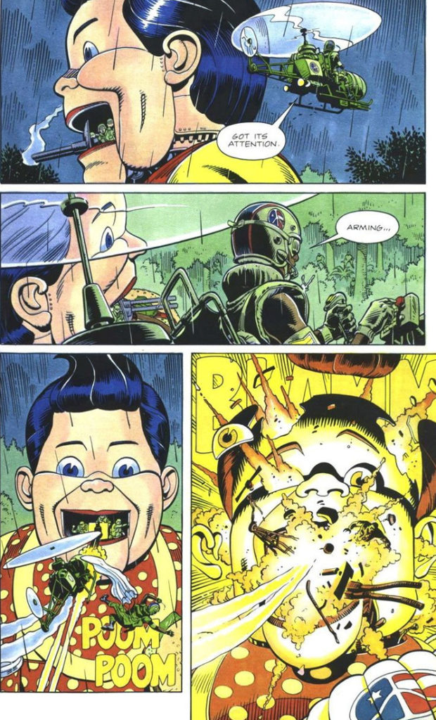 This charming little two-parter feels like a bigger, longer Calvin & Hobbes strip. It’s Calvin’s daydreams of Spaceman spiff, snowmen, and dinosaurs scaled to kaiju proportions.