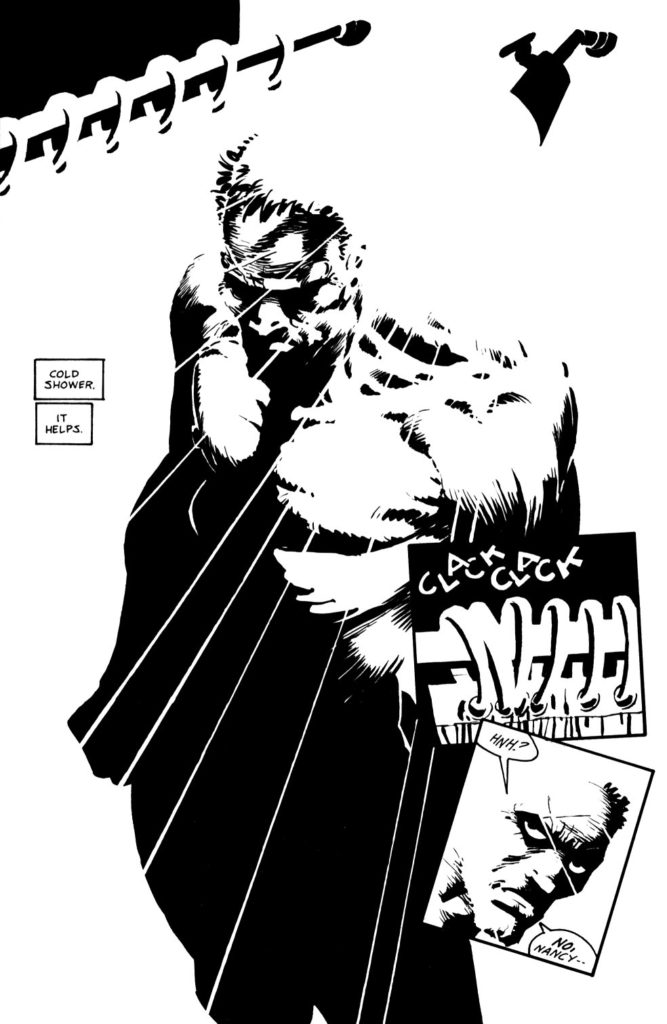 But the series is still an illustration marvel. Miller’s movement, compositions, and character designs are superb as ever. But his use of closure and conceal/reveal techniques is astounding. These books are still likely the best example you can find for this technique.