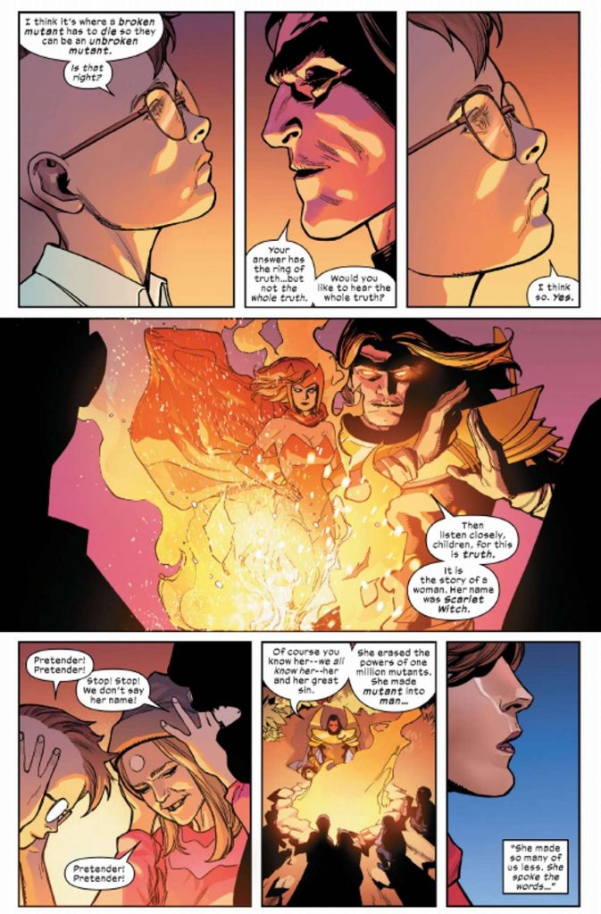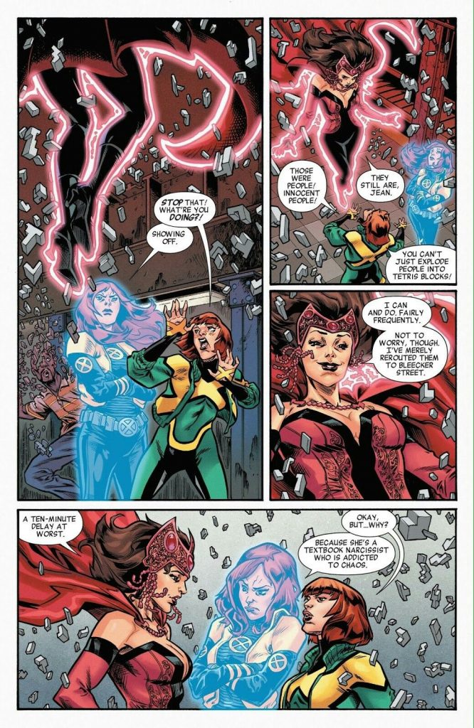 The elephant in the room here is that Marvel has not, in it’s entire decades long history, produced not even one great story where a female character actually gets to be the protagonist. Every major Marvel arc is about the men, with the women either crazy antagonists, or pointless sidekicks. Writers at Marvel regard her as a satellite of Magneto with no personality, and make little effort to adhere to even minimal consistency. Hickman, who cannot write female characters to save his life, writes her as a bumbling clown, Al Ewing writes her as a dumb teenager. Leah Williams goes even further and writes her as a 9 year old.