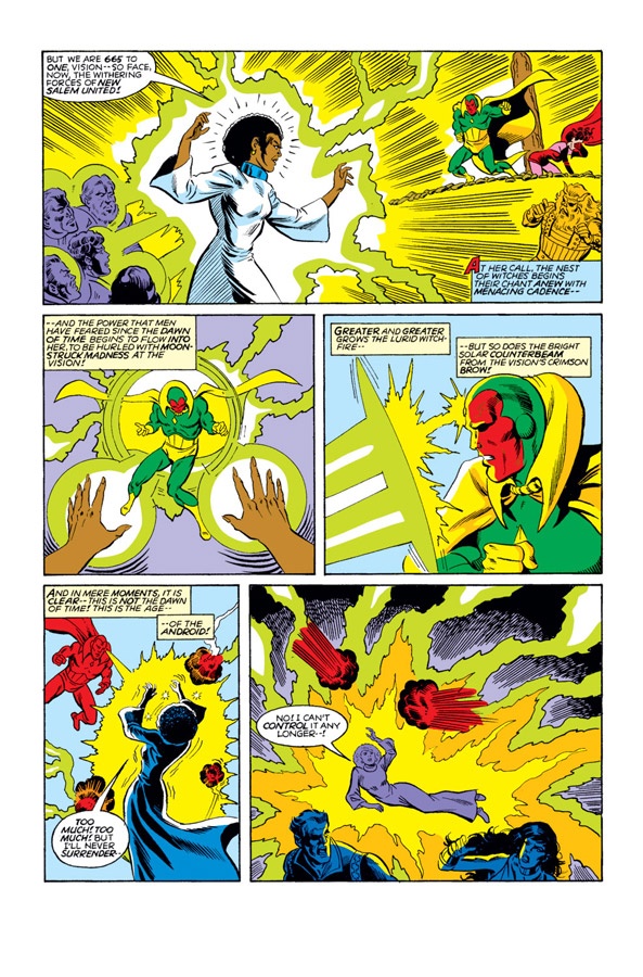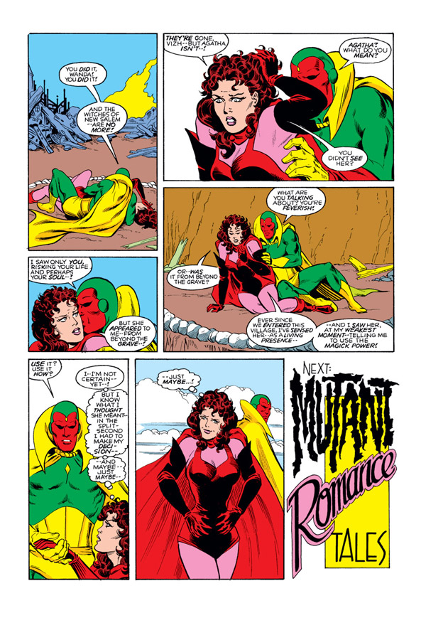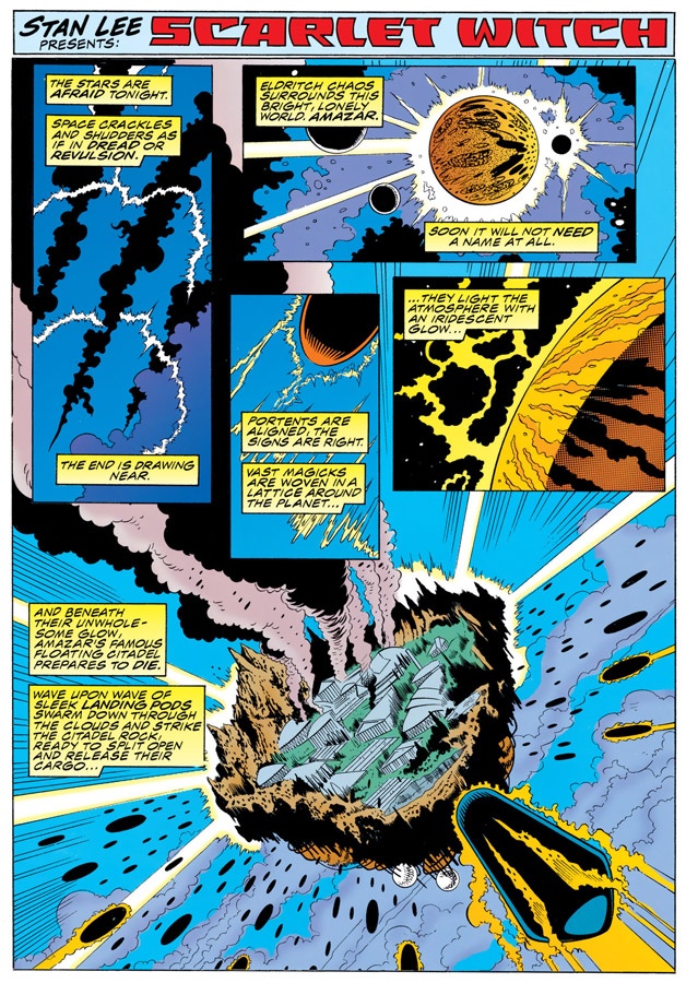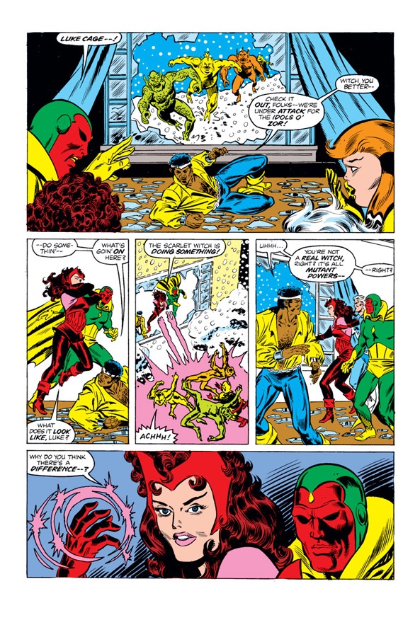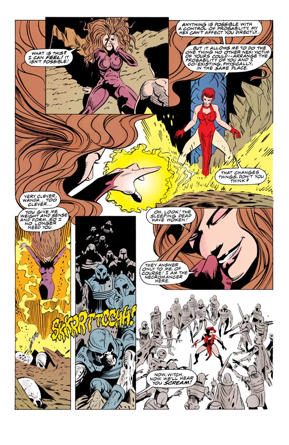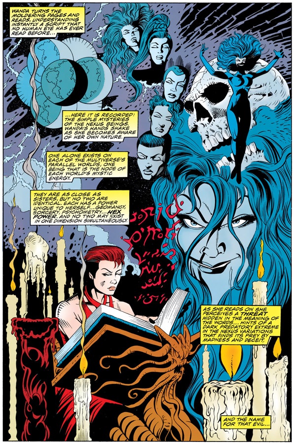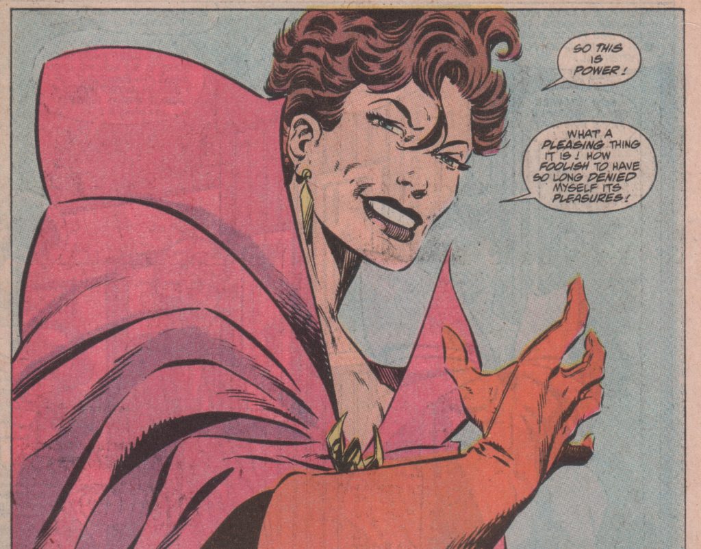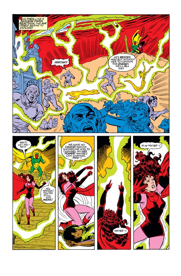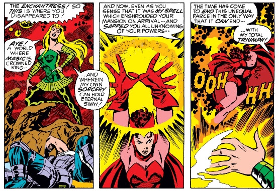 The answer was to give her something equally impossible that she could control. Roy Thomas, Steve Englehart, and Kurt Busiek either gave or increased the “Witch” part in Scarlet Witch. This gave Wanda the free-associating powers of her “hex spheres” and the focused intent of spellcraft. Things like summoning fire or tossing energy bolts gave her character a better sense of success.