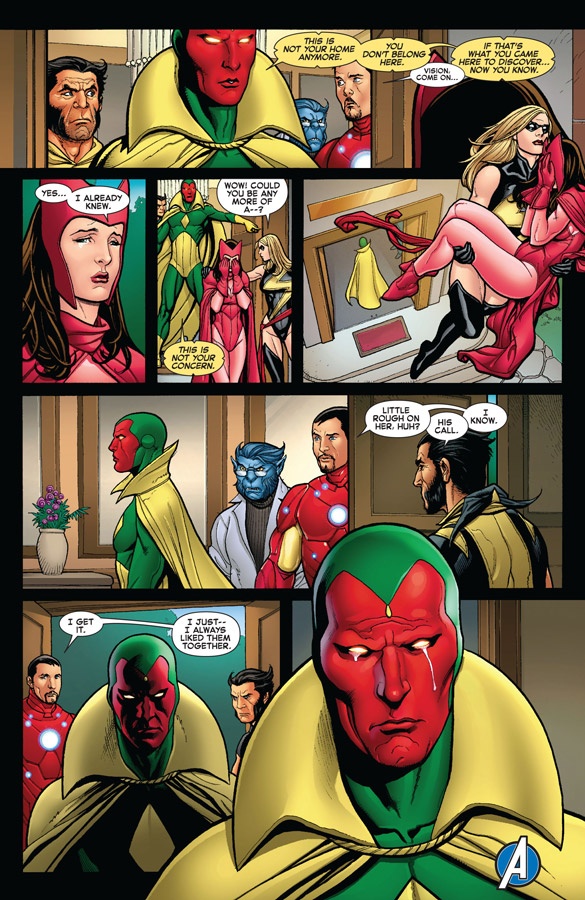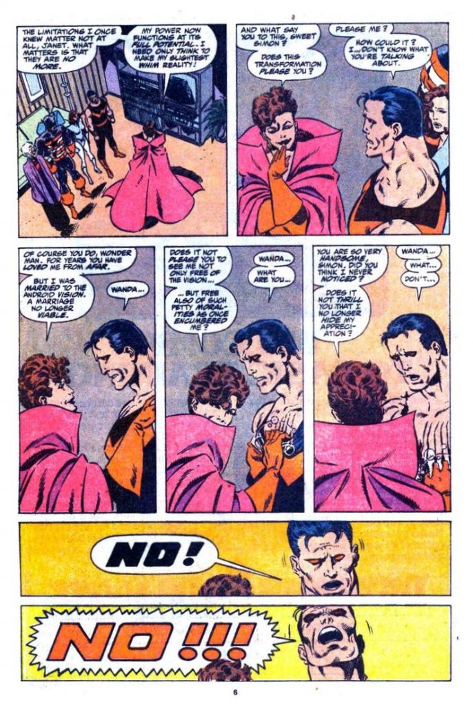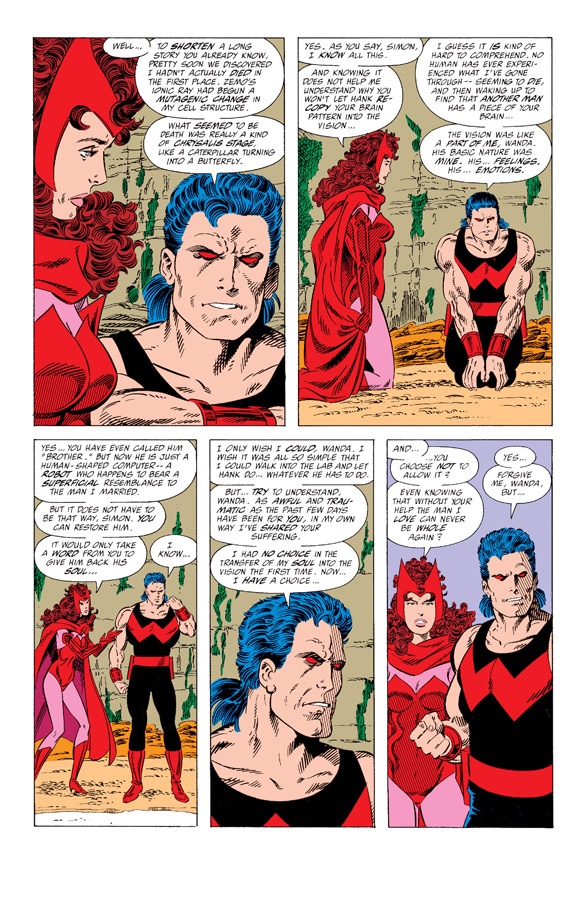 We learn that Wanda is in love with a single mind shared between two bodies — Wonder Man (the original) and Vision (brain-pattern copy and husband)