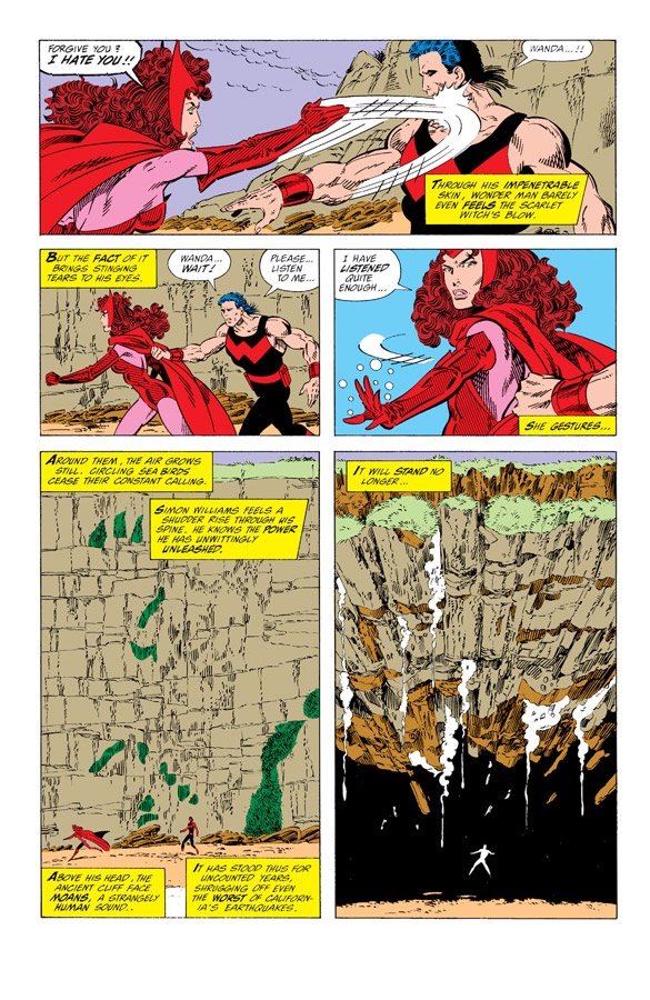 There’s a gulf between 1 and 4. One that means readers can see Wanda’s effect on the battle but struggle to evaluate her success in it. After all, Scarlet Witch doesn’t have “retaining wall” powers. This isn’t like Magneto with metal or Storm and lightning. Further, Wanda didn’t declare she’d cause a collapse, so it’s hard to measure her intent. Particularly when there was an equal likelihood of her powers causing a fissure to open beneath her target, a meteorite strike, or their sudden arrest for tax evasion.