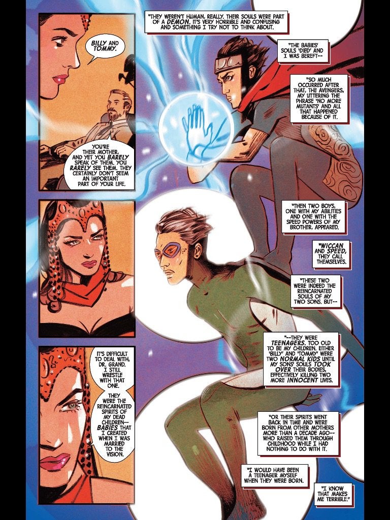 In her current state, the Scarlet Witch feels like the exception to too many of Marvel’s rules. To the point that I feel it’s messing with her agency, growth, even simple cause/effect dynamics!